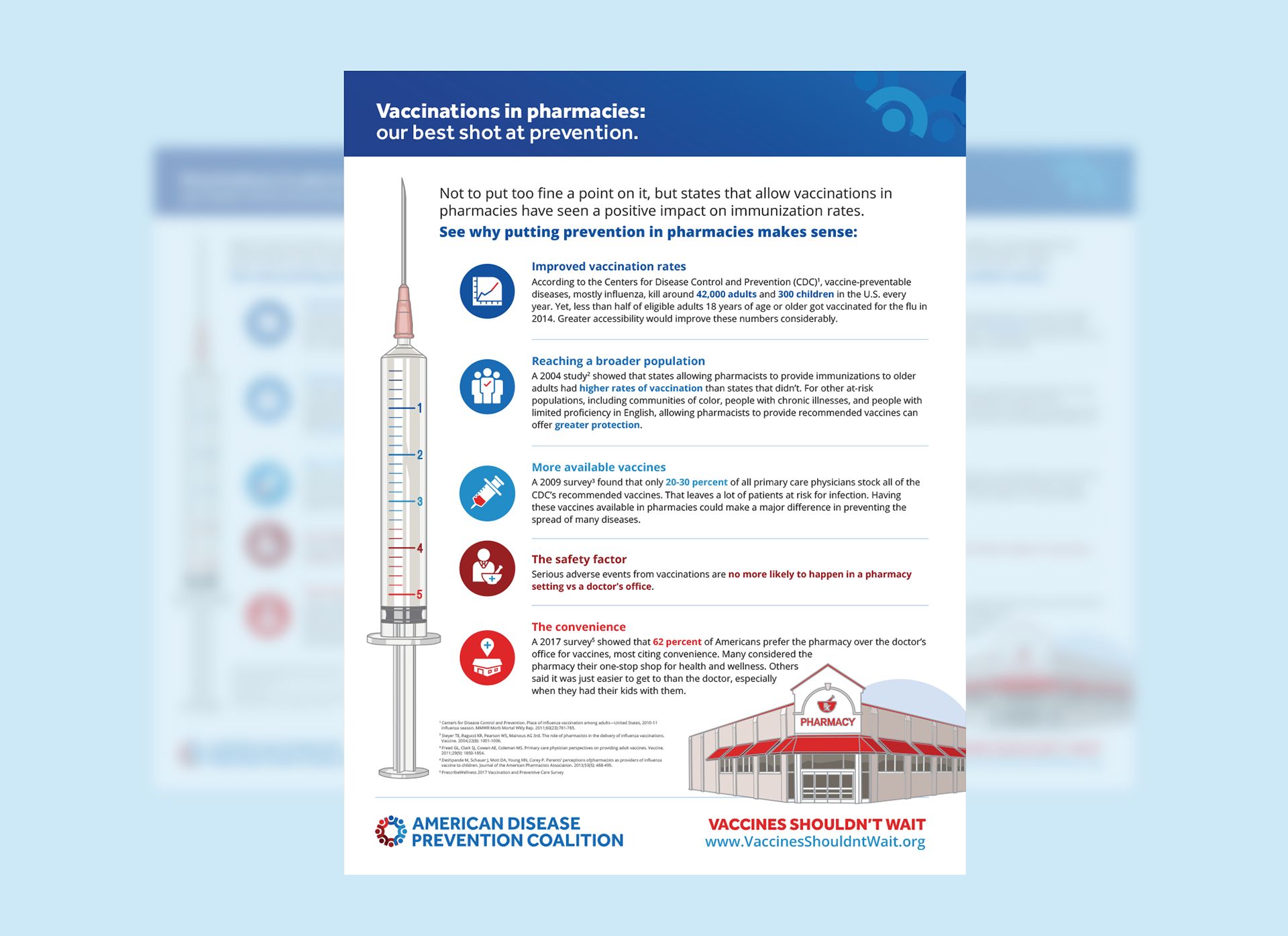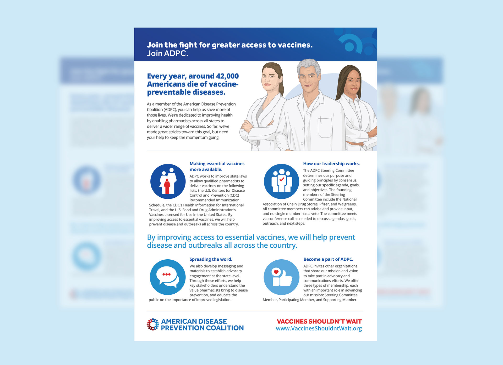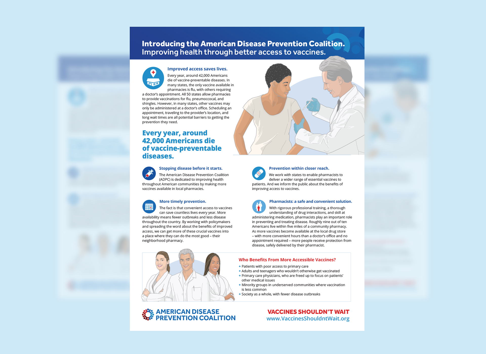The ADPC is a new coalition dedicated to improving health throughout American communities by making more vaccines available in local pharmacies. I designed the logo and collaborated with an illustrator and art director to create fact sheets and marketing materials.